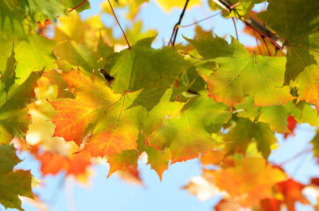 Autumn maple leaves on the background of the autumn sky. Shallow DOF