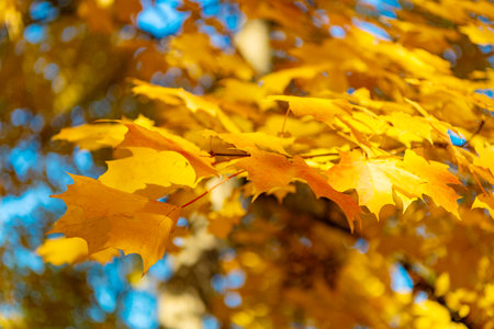 Yellow fall maple leaves against the sky. Indian summer or Autumn mood scene. Tilt-shift effect. Selective focus photography. Blurred seasonal nature background with copy space for text.