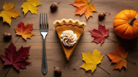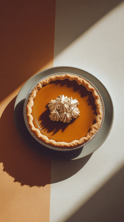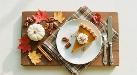 Pumpkin pie topped with whipped cream showcased under warm lighting and cozy atmosphere. Generated A.I.