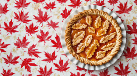 A beautifully arranged pumpkin pie with a crispy crust featuring decorative leaf shapes, set against a vibrant red leaf pattern background for autumn celebrations.