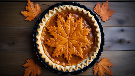 Pumpkin pie with autumn leaf on top on a wooden table