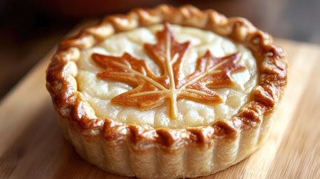 A stunning close-up view of a small pie topped with a beautifully crafted maple leaf design. This delicious dessert features a golden crust and creamy filling, perfect for any occasion.