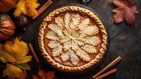 Top view of a pumpkin pie with a decorative crust pattern, surrounded by autumn leaves and cinnamon sticks on a rustic table