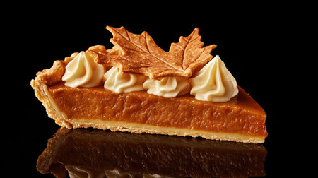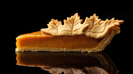 A beautifully presented slice of pumpkin pie showcases a decorative maple leaf crust against a striking black background, perfect for autumn-themed desserts.