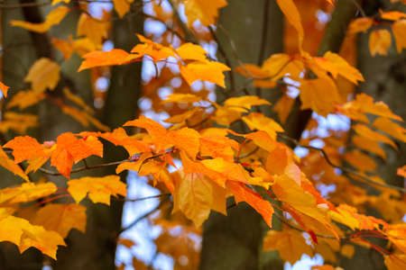 Orange maple leaves on the tree, blue sky, autumn natural background, selective focus