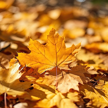 Autumn leaves background, Orange maple leaves on the ground with a bokeh effect defocused background AI generated