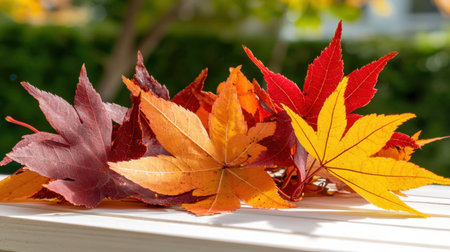 maple leaves bask in the warm sunlight streaming through a glass door, showcasing their vibrant hues of dark orange and beige. this captivating tabletop photograph captures a festive atmosphere, reminiscent of the narrative-driven visual storytelling found in the barbizon school. the wood elements add a touch of rustic charm to this carpetpunk-inspired composition. ai generated