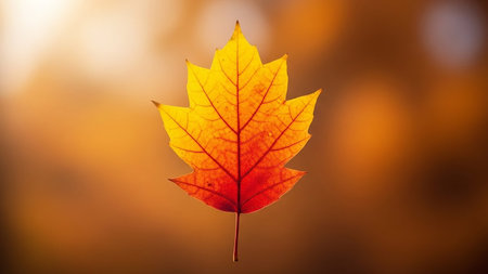 showing a single vibrant maple leaf in autumn colors, transitioning from bright yellow at the to deep red at the bottom, with visible veins and a stem, set...