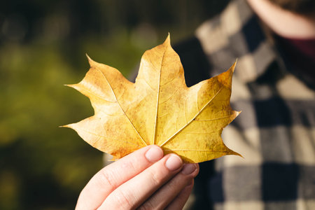 Close-up, yellow maple leaf in a mans hand in the forest.