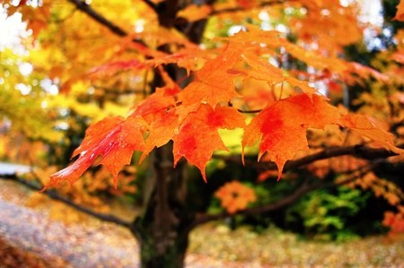 Selective focus of colourful autumn leaves on a maple tree, just after a rain