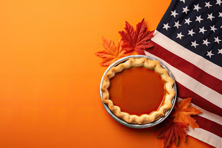 Thanksgiving Day banner featuring American Pumpkin Pie on an orange background