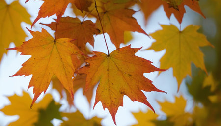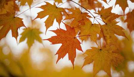 View of vibrant autumn leaves, displaying a palette of warm tones against a gentle bokeh backdrop.