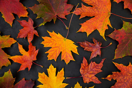 Colorful autumn maple leaves background, close-up, top view