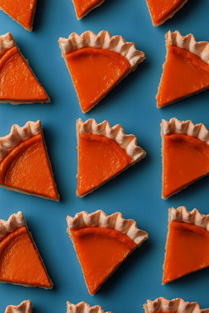 Bright orange dessert slices with flaky crust are beautifully arranged on a blue background, creating an eye-catching pattern that highlights their vibrant color and texture.