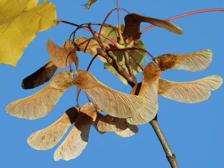 Autumn yellowed maple seeds. The seeds are close-up on a white background.