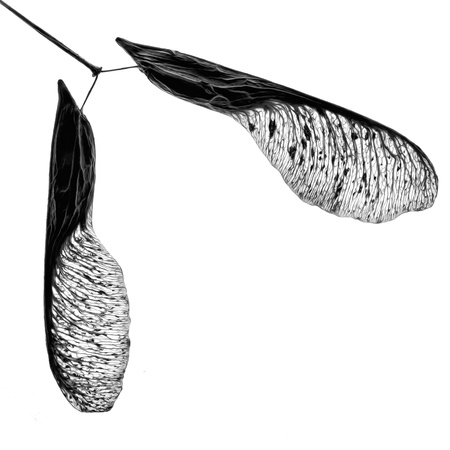 Macro close up, studio flash light picture, of a dry maple seed, autumn feelings. Detailed wing structure with stunning natural nerves, selective focus with shallow depth of field