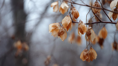 Beautiful dried maple seeds on a tree branch on bright winter day. Dry vegetation in winter season.