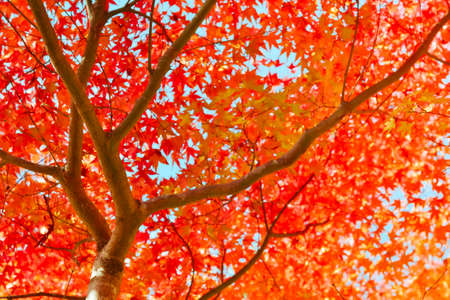 Red maple leaves on top of tree on blue sky background. Abstract fall season nature background