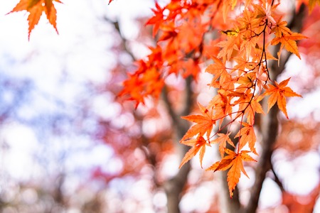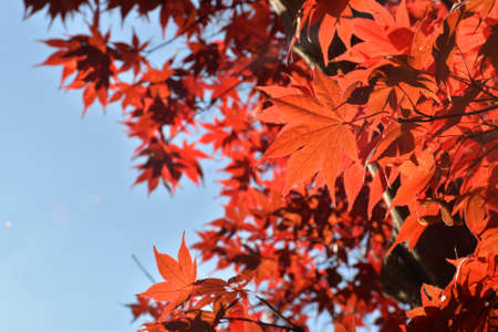 Beautiful maple leaves in autumn sunny day in foreground and blurry background in Kyushu, Japan. No people, close up, copy space, macro shot.