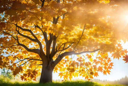 Stunning Autumn Maple Tree with Golden Foliage Under Vivid Sunshine, Captivating Nature s Beauty.