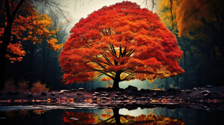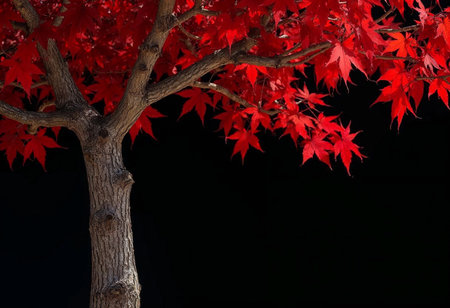 A striking maple tree showcases its fiery red leaves, creating a captivating contrast against a deep black background. The scene embodies the spirit of autumn with its stunning colors.