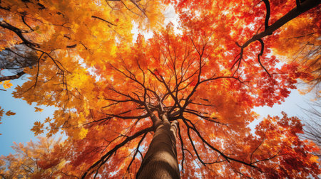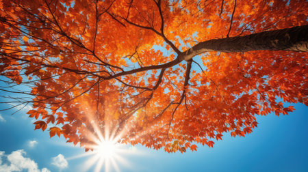 Generative AI : Beautiful colorful orange yellow and red autumn foliage of maple trees in a sunny day on the nature of looking up against blue sky