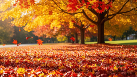 Beautiful autumn leaves falling in a serene park filled with vibrant colors during a sunny afternoon