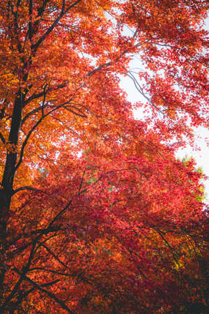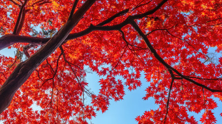 A stunning view of a red maple tree in autumn showcases vibrant leaves against a clear sky. This breathtaking scene captures the essence of seasonal change and natural beauty.