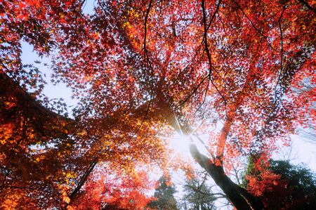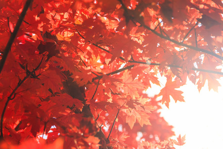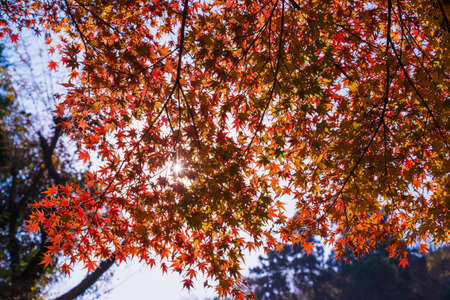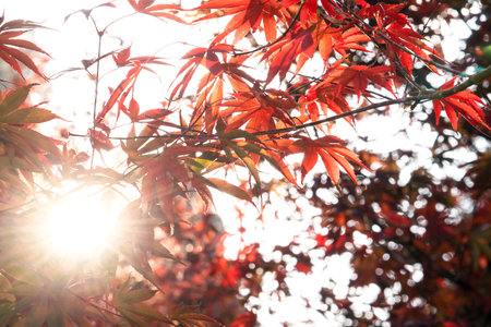 Autumn maple leaves with sunbeams in the background, Japan