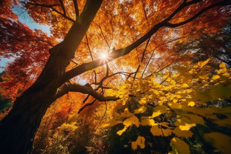 Generative AI : Beautiful colorful orange yellow and red autumn foliage of maple trees in a sunny day on the nature of looking up against blue sky