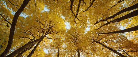 Trees in autumn park from below, yellow tops of trees, blue sky background. Generative AI