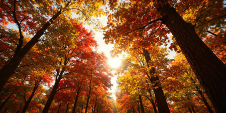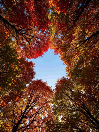 Autumn Forest Canopy A spectacular autumn forest viewed from below, with a canopy of red, orange, and gold leaves creating