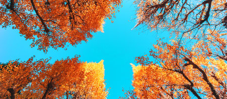 Autumn trees in the forest, panoramic view from below