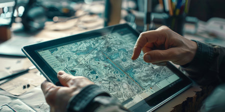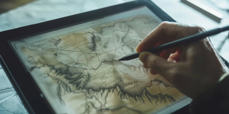In a studio, an artist uses a graphic tablet for detailed map illustrations, showcasing craftsmanship and creativity