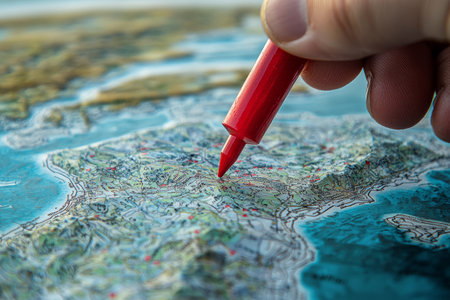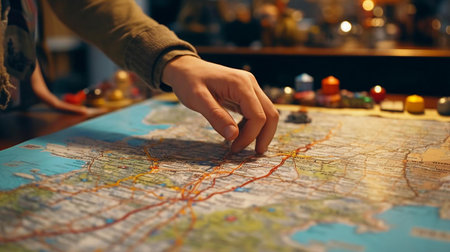 Close-up image of a person in a specific position on a map, symbolizing location, navigation, and strategy.