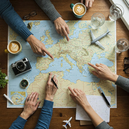 A top-down shot of two people planning a route on a vintage-style treasure map. A hand with a compass tattoo points to a location, symbolizing travel, adventure, and the desire for discovery and exploration.