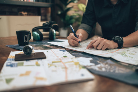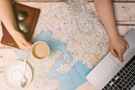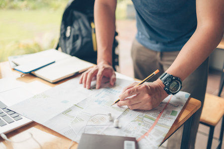Tourist planning vacation use pen pointing on the map and other travel accessories around on the table. Vocation, travel, holidays and backpack concept.