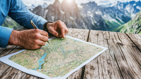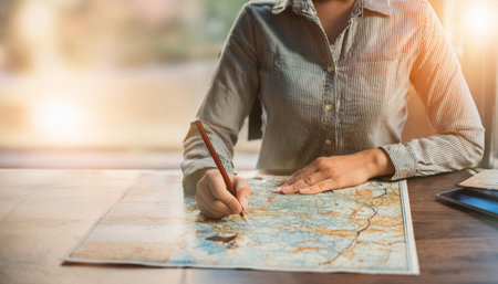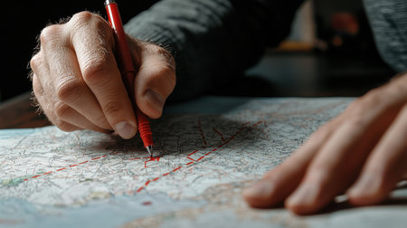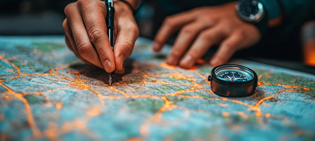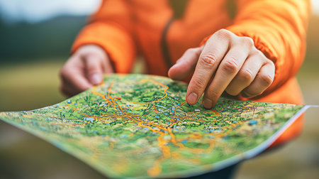 Hands trace route on map, symbolizing journey, planning, and achieving goals in outdoors.