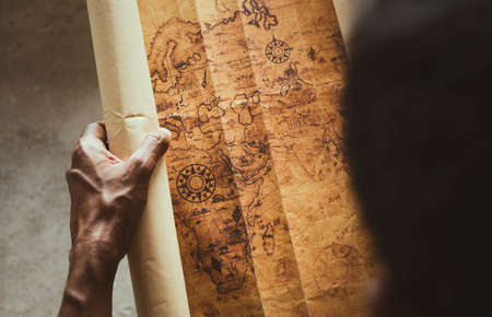 The picture of the group of the young or adult caucasian human focus and looking at a map of the world in a small room that has been filled with various object under bright sun in the daytime. AIGX03.
