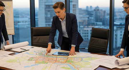 In a high-rise office boardroom, a female team leader points to a large city map spread on the table, strategizing with her colleagues. The team is engaged in urban planning, real estate development, or a major infrastructure project.