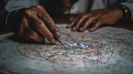 Hands carefully trace a star chart with a compass, highlighting the intricate details of the night sky in a vintage style. Perfect for astronomy enthusiasts.