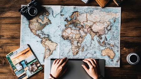A captivating scene featuring hands on a laptop set against a vintage world map, complemented by a camera, travel postcards, and a coffee cup, all evoking a spirit of adventure and exploration.