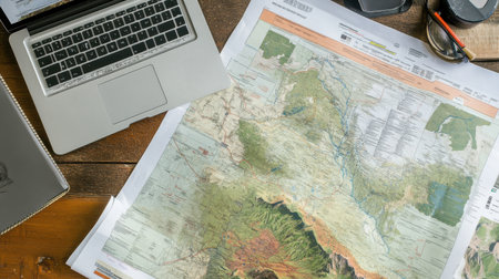 Desk with GIS map of environmental impact zones, laptop, and technical drawing of conservation plan