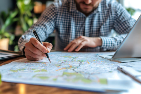 Man expanding business, analyzing data, and planning growth on a map. Developing strategy for future success