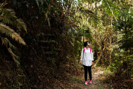 portrait of traveling woman walk on path in forest at Nantou, Taiwan
