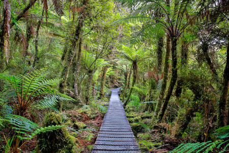 Wooden walkway in the rain forest. Sinking in mossy trees and numerous ferns. Haast, West Coast, New Zealand,