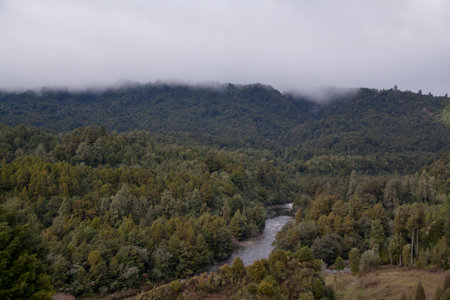 Misty dark dense bush lining Hatea River and Whangarei Falls..