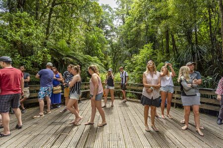 Waipoua Forest, New Zealand - December 29, 2018: People visiting Waipoua Kauri Forest on a sunny day in New Zealand.