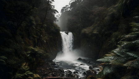 A breathtaking waterfall plunges through a dense, mystical rainforest.