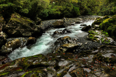 Mossy rocks and a stream in the rainforest of New Zealand